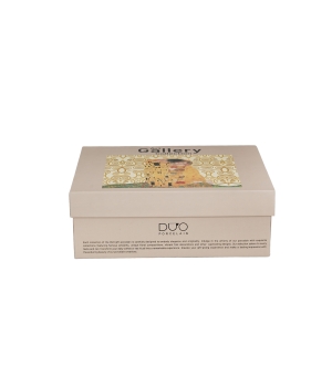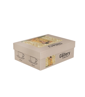 Komplet dwóch filiżanek do espresso 110 ml ze spodkami THE KISS ECRU inspired by Gustav Klimt wchodzący w skład serii Art Gallery, wykonany z porcelany New Bone China, charakteryzującej się elegancką i naturalną kremowo - białą barwą z delikatnym połyskiem, a także wyjątkową wytrzymałością.